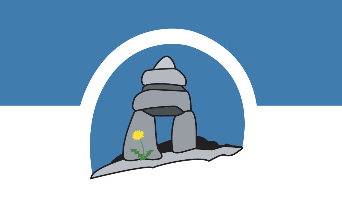 Au pied de l’inukshuk, on retrouve une fleur de pissenlit qui représente la population franco-nunavoise. « À l’image de la francophonie canadienne et nunavoise, la fleur de pissenlit résiste, par son entêtement, aux coups et s’adapte à son environnement. Souple, le pissenlit se replie pour résister aux tempêtes, mais il redresse toujours la tête, fier de résister aux intempéries. »